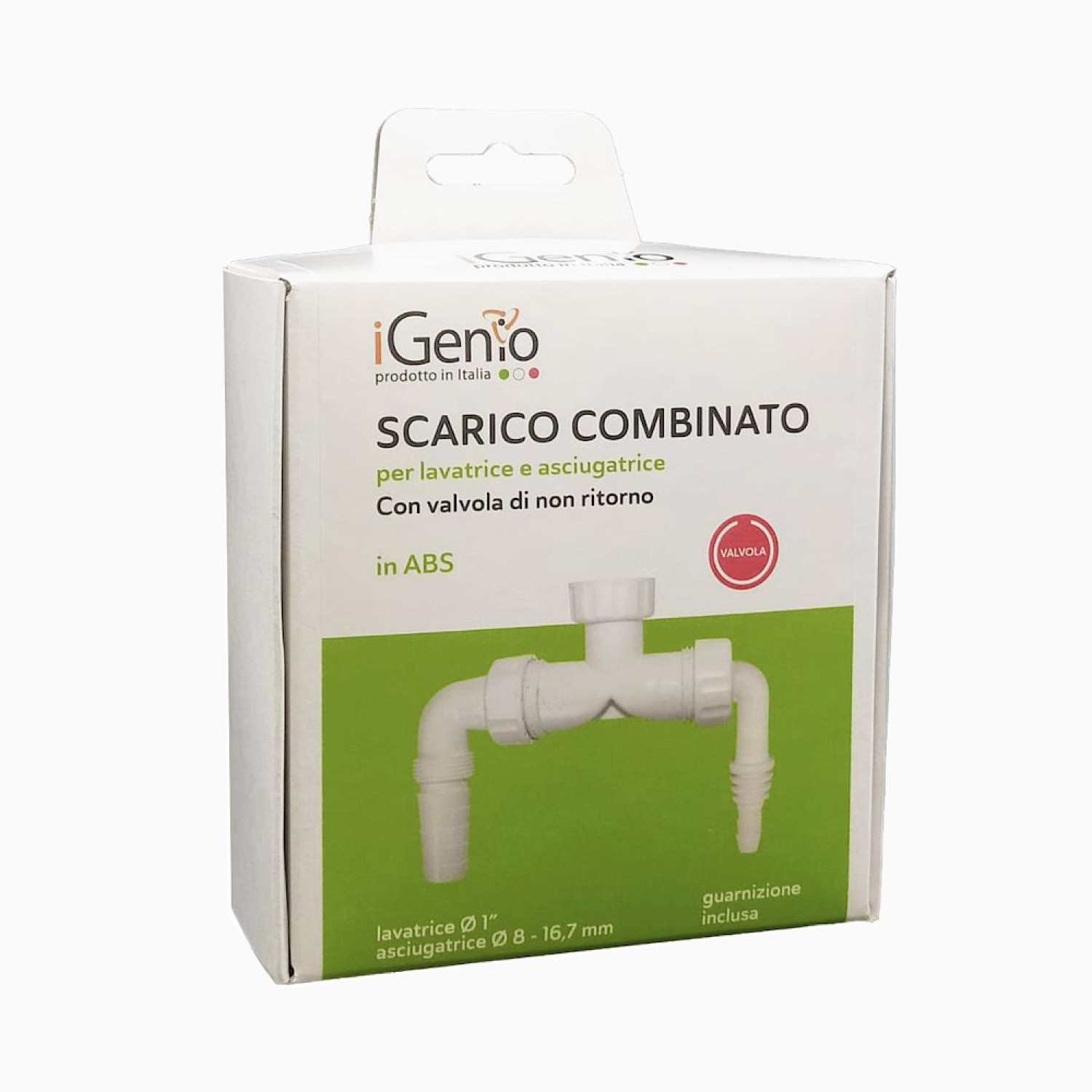 SCARICO COMBINATO PER LAVATRICE E ASCIUGATRICE CON VALVOLA DI NON RITORNO, Tipo di prodotto SCARICO COMBINATO PER LAVATRICE E ASCIUGATRICE CON VALVOLA DI NON RITORNO, Descrizione prodotto Lo scarico combinato da ø1" per lavatrice e asciugatrice in ABS è dotato di valvola di non ritorno ed è reversibile. Lo scarico combinato risolve il problema di dover svuotare il serbatoio acqua dell’asciugatrice, permettendo di far fluire la condensa direttamente nello scarico a parete. L’installazione è semplice ed intuitiva, collegare il tubo dello scarico lavatrice all’entrata da Ø17,80 mm, poi collegare il tubo dello scarico dell’asciugatrice all’entrata da Ø 8/16,7 mm. Per una maggiore garanzia, si consiglia di fissare stringendo con delle fascette entrambi i tubi di scarico. Lo scarico combinato non necessita di manutenzione. 2 valvole di non ritorno Incluse. 1 guarnizione Inclusa., Anni di garanzia del costruttore 2,000, Peso (Kg) 0,200, Quantità minima ordinabile 6,000, Unità di misura della quantità minima ordinabile Pezzi