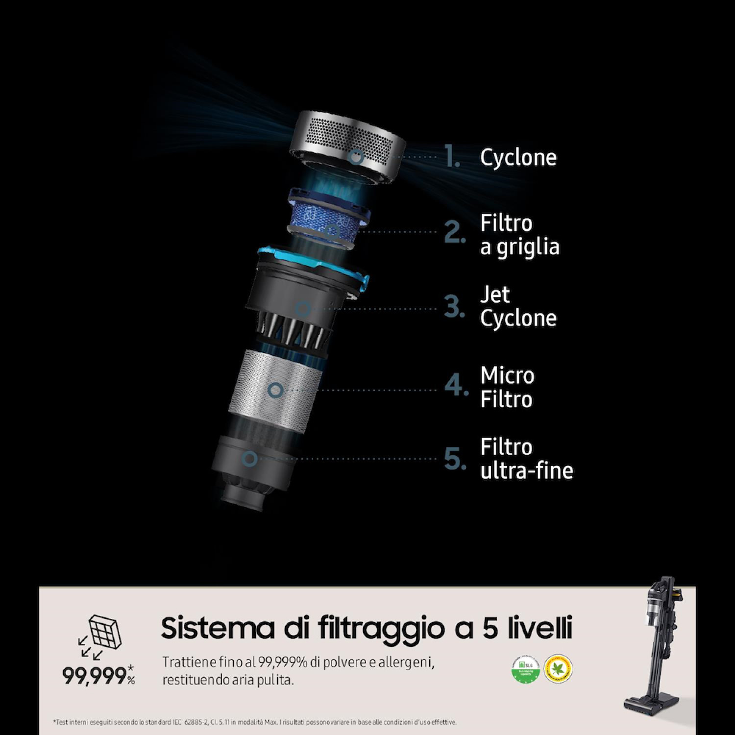 samsung Scopa elettrica JET95 complete extra, Potenza massima in Watt 210,000, Rumorosità (Db) 86,000, Indicatore sacco pieno No, Accessori integrati Spazzola LED Slim Action • Spazzola Pet Mini+ • Mini Spazzola • Lancia per la polvere estensibile • Accessorio flessibile • Base Self standing con doppia postazione di ricarica 2 BATTERIE INCLUSE, Filtro HEPA No, Riavvolgimento automatico del cavo No