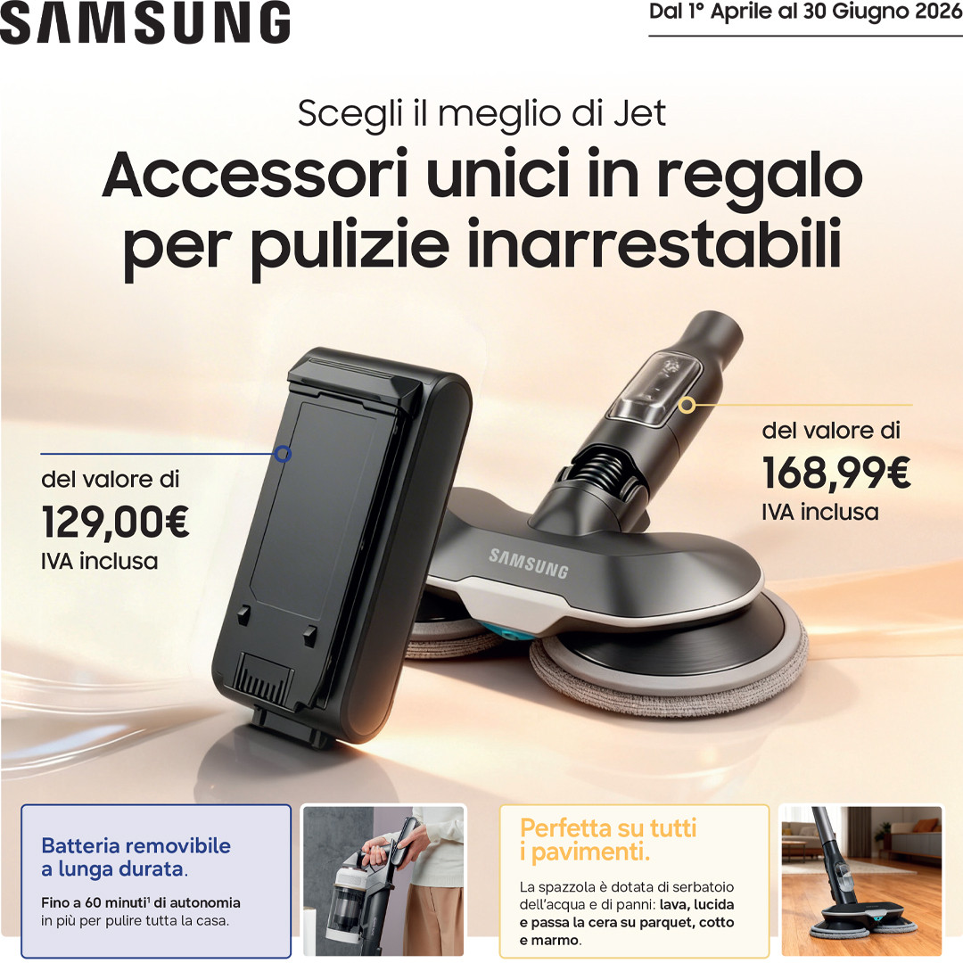 samsung Scopa elettrica JET95 complete extra, Potenza massima in Watt 210,000, Rumorosità (Db) 86,000, Indicatore sacco pieno No, Accessori integrati Spazzola LED Slim Action • Spazzola Pet Mini+ • Mini Spazzola • Lancia per la polvere estensibile • Accessorio flessibile • Base Self standing con doppia postazione di ricarica 2 BATTERIE INCLUSE, Filtro HEPA No, Riavvolgimento automatico del cavo No