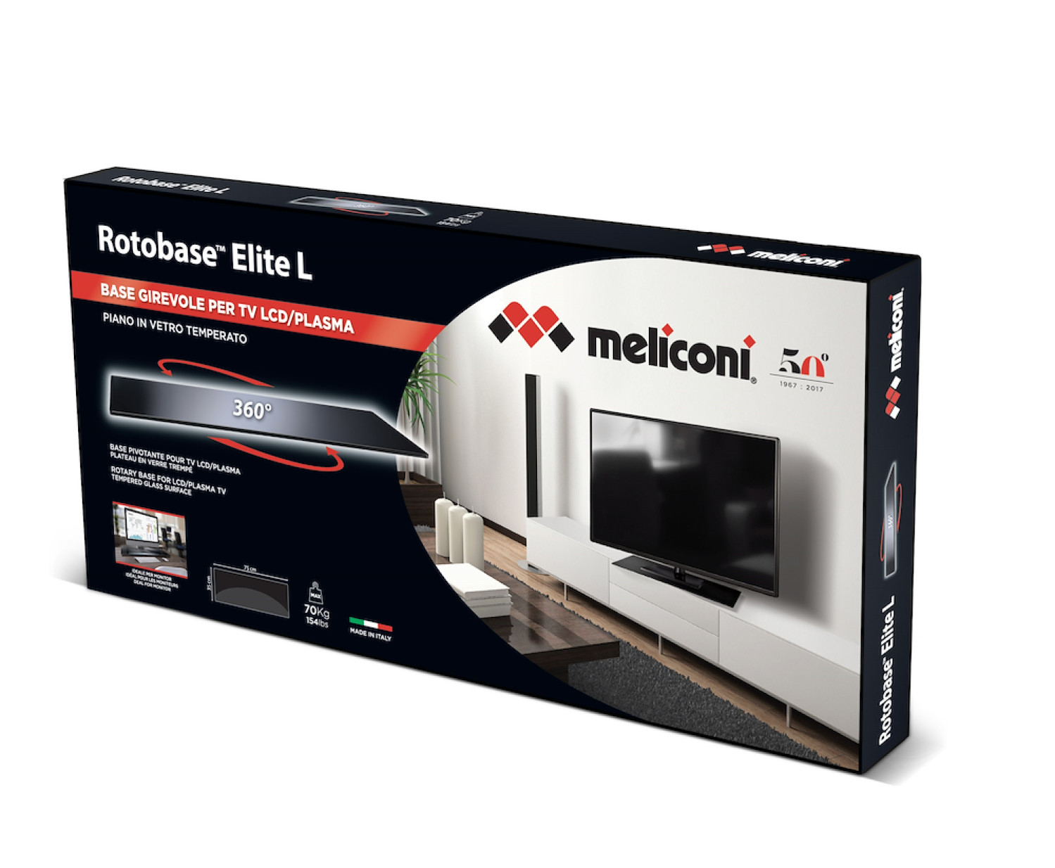 Rotobase Elite L è una base in vetro temperato ruotabile 360° che permette di orientare la TV in qualsiasi direzione. Tipologia Mobile, Dimensione pollici min (") 14,000, Dimensione pollici max (") 63,000, Inclinazione verticale No, Rotazione orizzontale Sì, Materiale struttura vetro temperato, Numero ripiani 1,000